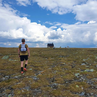 Första etappen var en knappt 7 km lång stigning på ungefär 600 meter från byn i Borgafjäll upp till Galloe och Galloe-stugan. Jag skulle gott och väl kunna tänka mig att övernatta där någon gång. Tänk att få krypa ner i sovsäcken efter att ha tänt en brasa i vedkaminen, höra vinden tjuta utanför och sedan få vakna upp till vidderna på morgonen. Men det får bli ett äventyr en annan gång. Nu måste vi springa vidare.